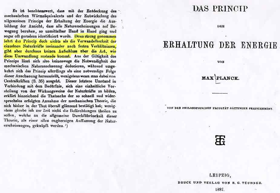 Als Max Planck seine Arbeit "Das Princip der Erhaltung der Energie" verfasst hatte (die Veröffentlichung fand 1887 statt), gab es einige Bemerkungen dazu: