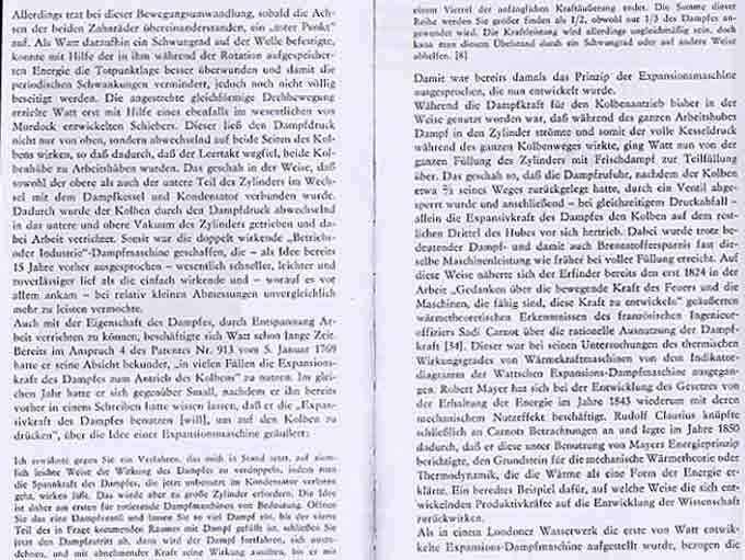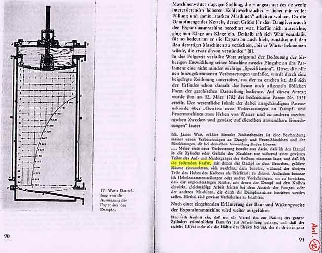 Diese Darstellung von James Watt ist im Grunde das Indikatordiagramm, wie wir es heutzutage nennen. Die Gleichungen (vor 18) und (18) beschreiben also keine naturgesetzlichen Erscheinungen, da der Druck "p" real nicht konstant ist. Anlage 7a , Anlage 7b , Anlage7c. In den Formeln (nach 18) und (19) ist "v" mit der Gaskonstante "R" verbunden. Das bedeutet, dass "v" dort ein spezifisches Volumen ist, also ein Stoffwert. Es handelt sich dabei um den Kehrwert des spezifischen Gewichtes, in diesem Falle eines Gases. Anlage 11a , Anlage 11b, Anlage 11c, Anlage 11d, Anlage 11e.