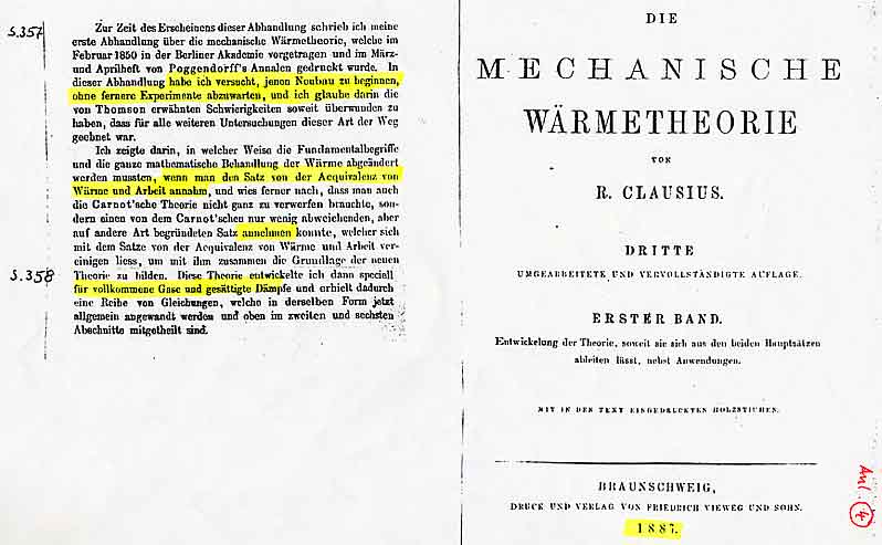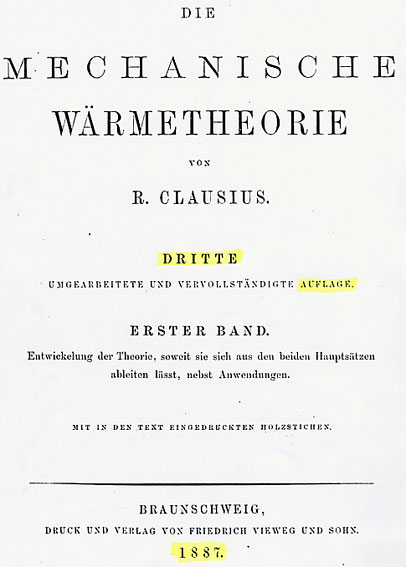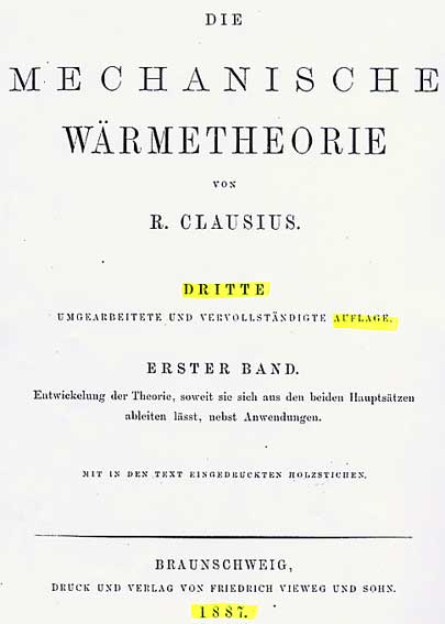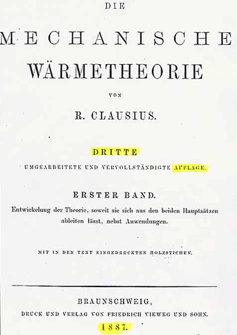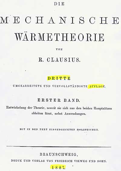 Clausius, 28-jährig im Jahre 1850, hielt an diesem Leitgedanken bis zum Jahre 1887 fest, als die letzte Ausgabe seiner MECHANISCHEN WÄRMETHEORIE erschien. Diese wenig verbreitete Ausgabe liest sich streckenweise wie eine Entschuldigung für sein mit vielen Fremdworten begleitetes, mathematisches Formelwerk. Anlage 4.