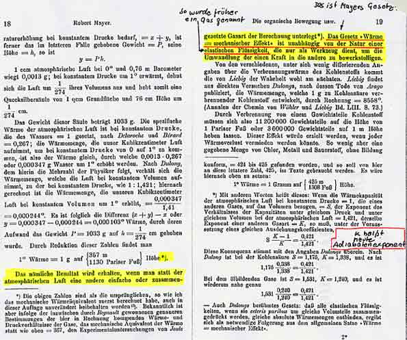 Eine "elastische" Flüssigkeit war im Sprachgebrauch der damaligen Zeit ein Gas oder ein Dampf. Auch die später angefügten Fußnoten weisen auf gaskinetisches Formelmaterial hin, wobei der von Mayer verwendete Buchstabe "K" für den Adiabaten-Exponenten steht. Und in welchem Aggregatzustand sich eine Adiabate, die den angeführten Formeln gehorcht, ausbilden kann, ist wohl unstrittig. Der Text in Anlage 19a, ist identisch mit dem in Anlage 12b.