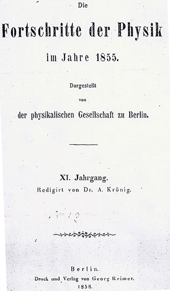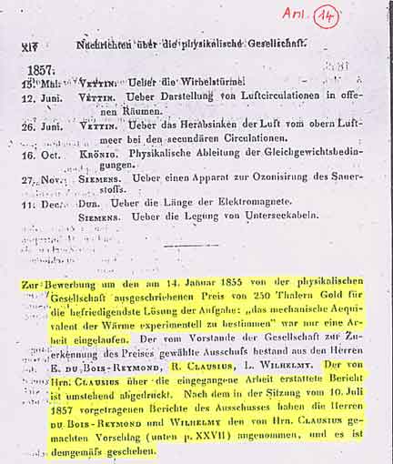 Beurteiler dieser Arbeit und späterer Berichterstatter vor der Berliner Akademie war Rudolf Clausius, damals 33-jährig. Der Bericht erschien 1858. In ihm "knallte" es gleich zweimal. Anlage 14a , Anlage 14b, Anlage 14c, Anlage 14d, Anlage 14e, Anlage 14f, Anlage 14g, Anlage 14h, Anlage 14i , Anlage 14j, Anlage 14k, Anlage 14l, Anlage 14m, Anlage 14n, Anlage 14o, Anlage 14p.