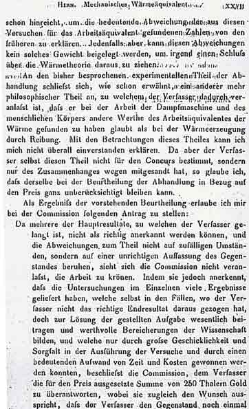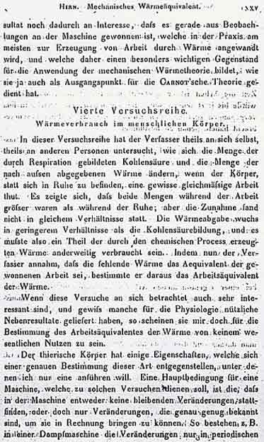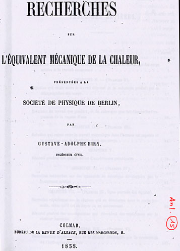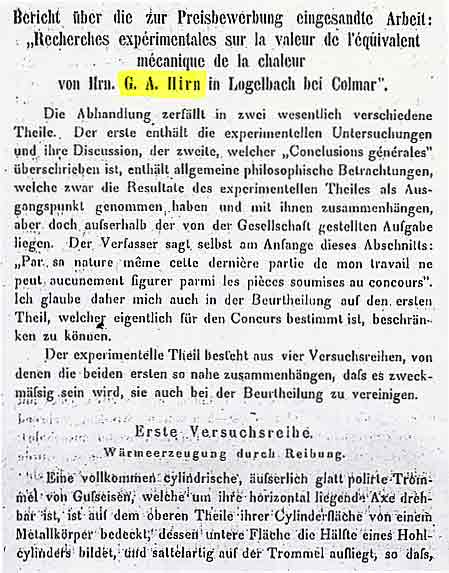 Dann erschien der Elsässer Adolf Hirn auf der wissenschaftlichen Bühne. Er hatte an zwei verschiedenen laufenden Dampfmaschinen der damaligen Zeit das mechanische Wärmeäquivalent gemessen. Die Ergebnisse teilte er der Berliner Akademie der Wissenschaften mit, die einen Preis für einen messtechnischen Nachweis des mechanischen Wärmeäquivalentes ausgesetzt hatte.