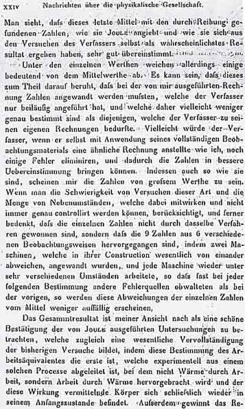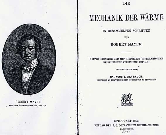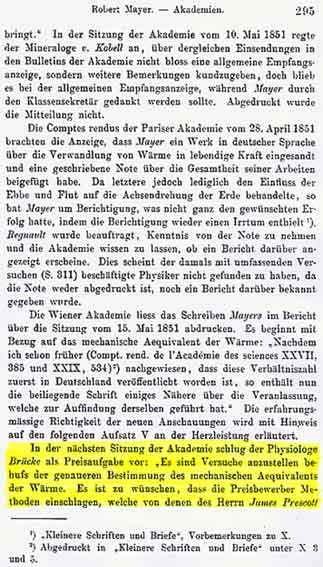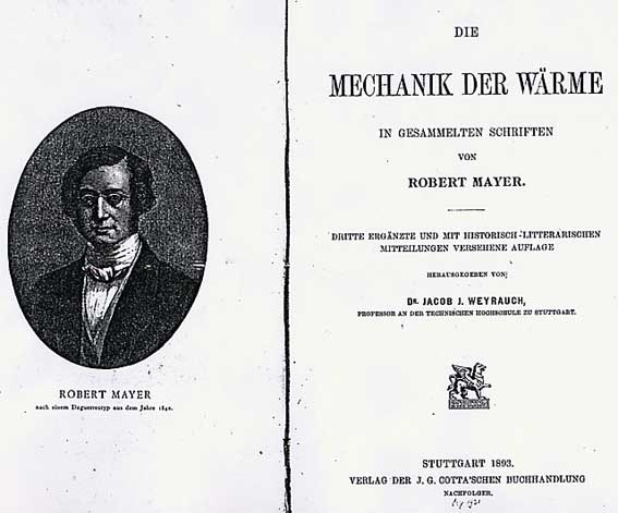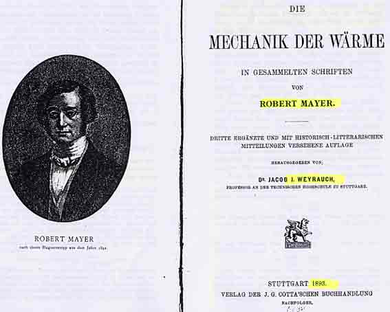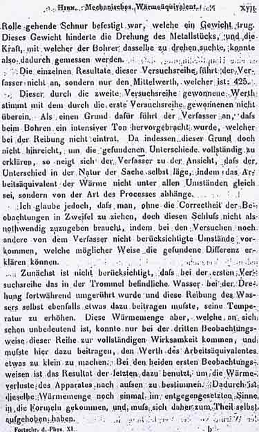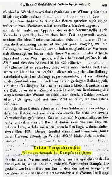 Auf dieser Grundlage hatte Mayer berechnet, laut vorgelegter Tabelle auch Holtzmann 1845 und Clausius 1850. Bereits 1830 ging Sadi Carnot ähnlich vor. Messwerte für das mechanische Äquivalent der Wärme als Kehrwert des calorischen Wertes der Arbeit gab es bis zum Jahre 1850 nicht.