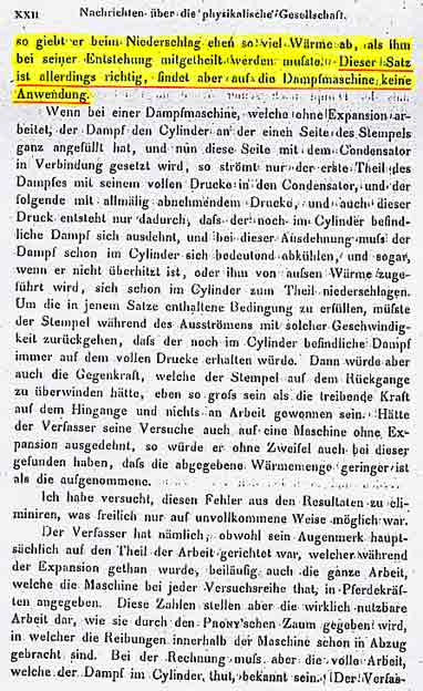 "Das nämliche Resultat wird erhalten, wenn man statt der atmosphärischen Luft eine andere einfache oder zusammengesetzte Gasart der Berechnung unterlegt. Das Gesetz "Wärme = Mechanischer Effekt" ist unabhängig von der Natur einer elastischen Flüssigkeit, die nur als Werkzeug dient, um die Umwandlung der einen Kraft in die andere zu bewerkstelligen."