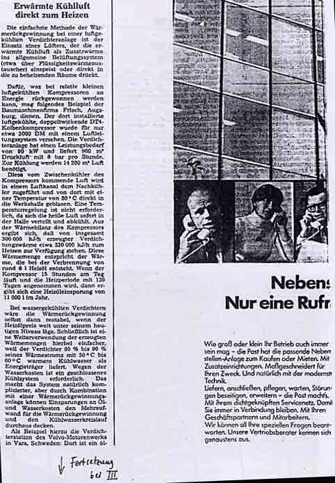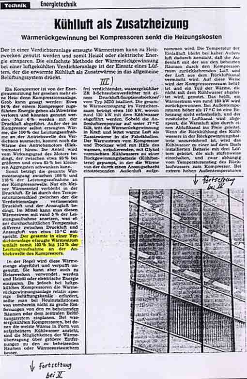 Im Prinzip vergleichbar ist eine Messung der Firma Atlas Copco, veröffentlicht 1979. Dabei hat man sekundärseitig die Energien "Pressluft" und "Kompressionswärme" zusammengefasst und ins Verhältnis gesetzt zur primärseitigen Antriebsenergie des Kompressors. So erhielt man Wirkungsgrade von über 100%. Ein Wunder? N E I N! Der Fehler liegt in der Verwendung von Berechnungsformeln, zu denen keine unanfechtbaren Messergebnisse vorliegen. Anlage 18a, Anlage 18b, Anlage 18c, Anlage 18d.