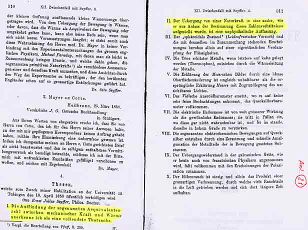 Noch ein Mann ist hervorgetreten. Der Historiker J. J. Weyrauch bemühte sich, Arbeiten, Veröffentlichungen und Korrespondenzen Robert Mayers zusammenzutragen und zu veröffentlichen. Auch berichtete er über gegenteilige Meinungen zu Mayers Auffassungen, was eigentlich zu Dank verpflichtet. Dann attackierte er einen gewissen Otto Seiffer, der zwar den Äquivalenzwert zwischen mechanischer Kraft und Wärme (= calorischer Wert der Arbeit) anerkannte, jedoch den Übergang von einer Naturkraft in die andere als unwissenschaftlich bezeichnete. Anlage 21a, Anlage 21b.