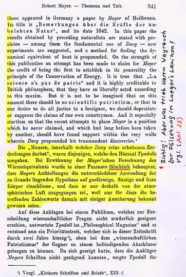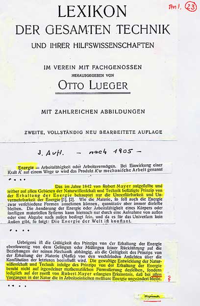 Und dann bekam derselbe Herr Weyrauch wenige Jahre später den Auftrag in "LUEGERS LEXIKON DER GESAMTEN TECHNIK" das Kapitel "Energie" zu bearbeiten. Dort log der Epigone, indem er mitteilte, dass Mayer zuerst zu der Erkenntnis gelangte, dass bei allen Vorgängen in der Natur die in Arbeitseinheiten messbare Energie unverändert bleibt. Anlage 23