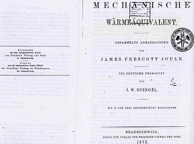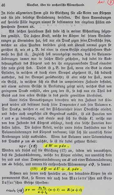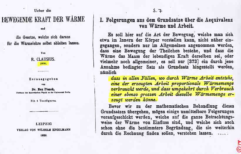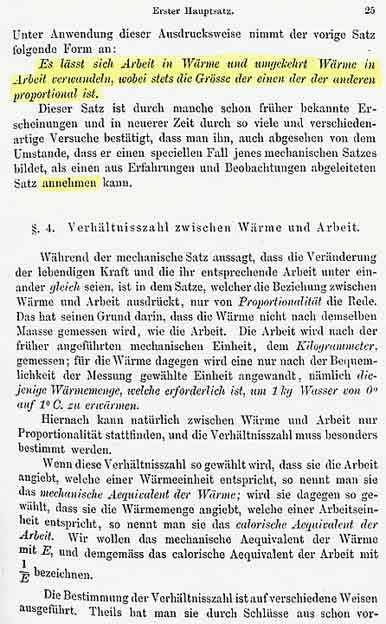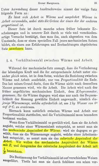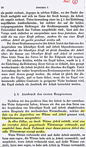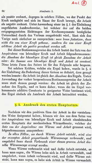 Theoretischer Grundsatz zum Energieprinzip (von 1850 durch Clausius formuliert) als Grundlage zur Algebraisierung der Naturgesetze, nämlich "dass in allen Fällen, wo durch Wärme Arbeit entstehe, eine der erzeugten Arbeit proportionale Wärmemenge verbraucht werde, und dass umgekehrt durch Verbrauch einer ebenso grossen Arbeit dieselbe Wärmemenge erzeugt werden könne". Anlage 3