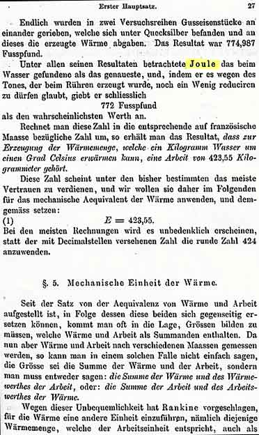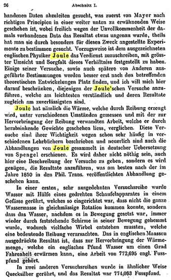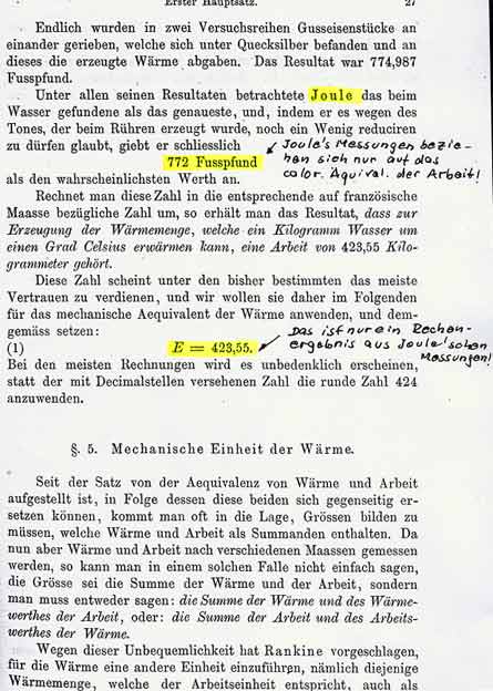 Zuvor wurde dargelegt, dass Clausius nur die Messergebnisse von Joule als Beweismittel für seine Theorie über die energetische Gleichwertigkeit von Wärme und mech. Arbeit heranzog. Joule hatte aber nur den calorischen Wert der Arbeit ermittelt, indem er sich maßgeblich auf die Wärme konzentrierte, die beim Reiben, Bohren, Quirlen oder Komprimieren entstand.