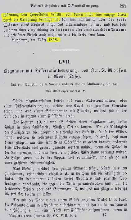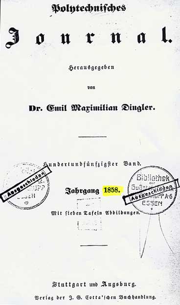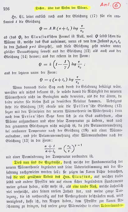 Clausius musste antworten. Er tat dies im gleichen Jahr 1858 und in der gleichen Zeitschrift, in "Dinglers Polytechnisches Journal". Eine Doppelseite stammt aus dieser Verteidigungsschrift, ... und die ist diskussionswürdig, denn es begann die exzessive Algebraisierung der Naturwissenschaften mit Stolpersteinen Anlage 7a, Anlage 7b, Anlage 7c,: