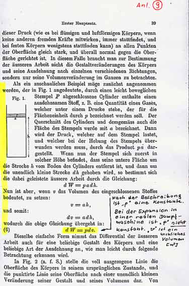 Die Formel (vor 18) holt sich Clausius aus einer Kolbenweg-Druck-Betrachtung, wobei zu bemerken ist, dass "p" in dieser Schreibweise mathematisch als Konstante zu behandeln ist, was für die Vorgänge im Zylinder einer Dampfmaschine keineswegs zutrifft, also falsch ist. Anlage 9a, Anlage 9b.